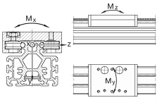 - 滑塊導軌系統的許用扭矩 這些數值是單一載荷,當執行器的下部完全被支承時使用。 當承受聯合載荷時,這些值必須減小。
